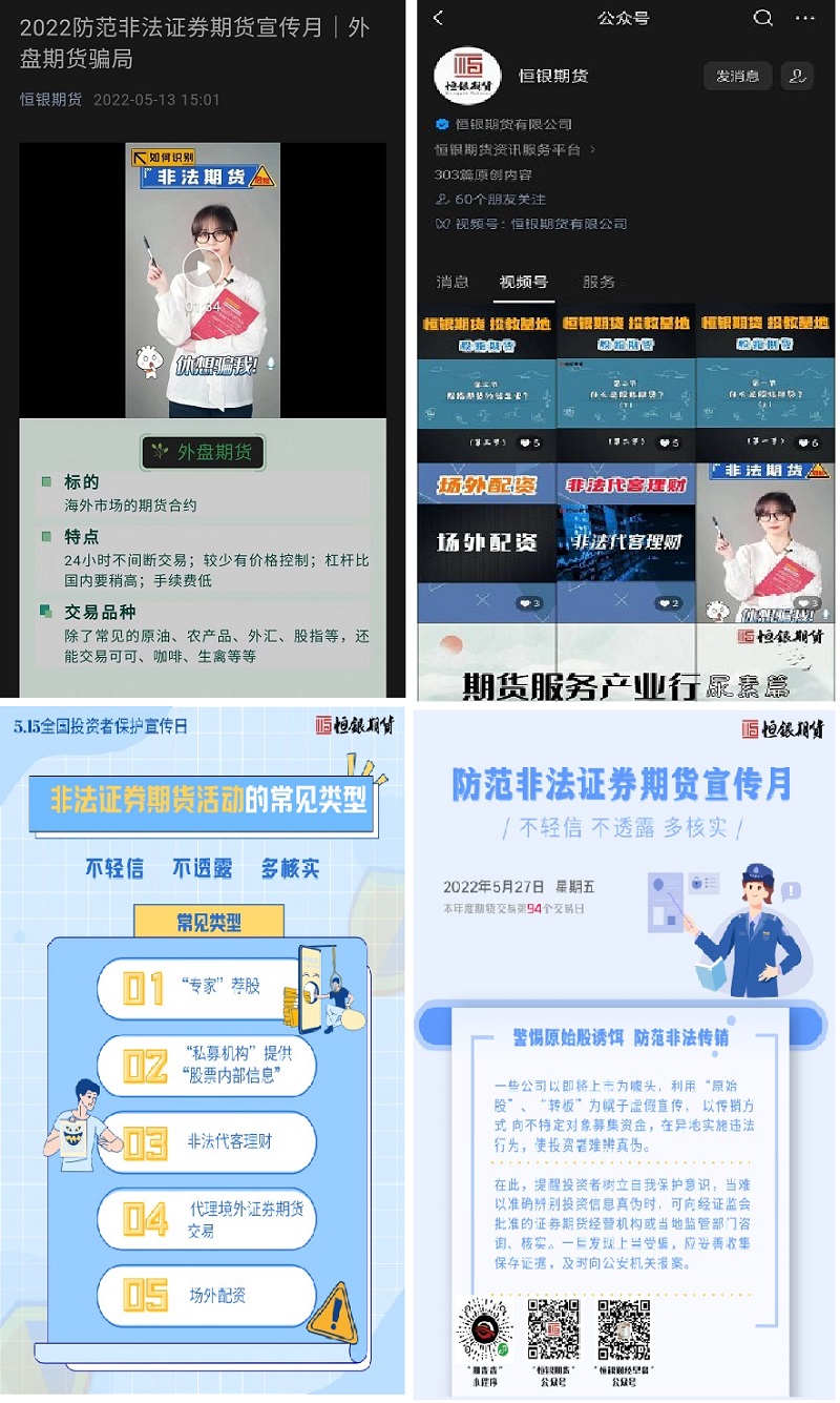 线下活动进行的同时,恒银期货公众号、视频号也在推进反诈防非的内容宣传,通过图文讲解、短视频、宣传海报等多种方式传播知识,增强投资者反诈意识。
