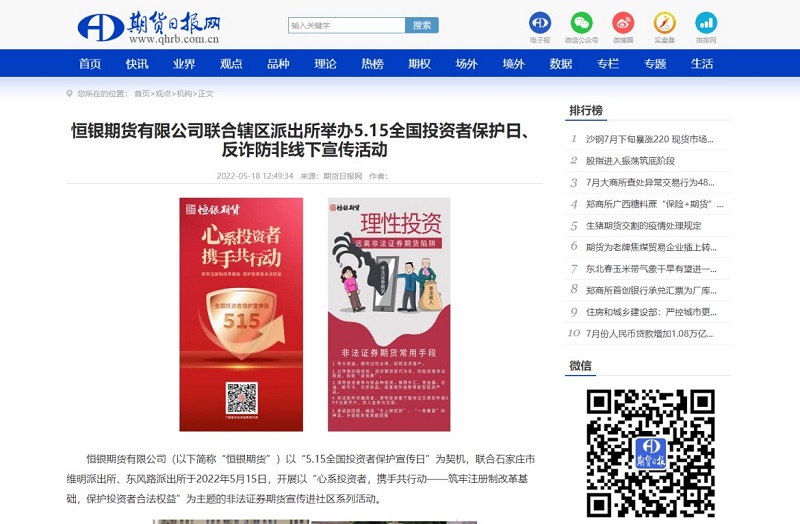 2022年5月15日,恒银期货以“5.15全国投资者保护宣传日”为契机,联合石家庄市维明派出所、东风路派出所,开展以“心系投资者,携手共行动——筑牢注册制改革基础,保护投资者合法权益”为主题的非法证券期货宣传进社区活动。走进金鼎小区和东风小区,对过往居民进行了非法证券期货宣传,同时对5.15投资者保护宣传日进行普及。