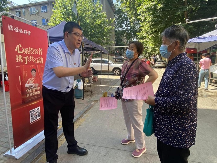 为进一步深入贯彻落实处置非法集资部际联席会议相关工作要求,根据河北省打击和处置非法集资工作领导小组印发的《2023年防范非法集资宣传月活动动作方案的通知》,2023年6月15日,国富投资集团所属恒银期货有限公司(以下简称“恒银期货”)联合东风路派出所,由恒银期货总经理汤志江、副总经理张南组织公司各部门骨干力量深入社区,开展了防范非法集资的线下宣传活动。