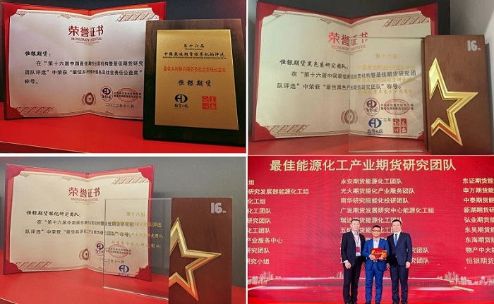 本届评选于今年4月启动,在历时四个多月,经过手机投票、专家评审等环节,恒银期货最终荣获“最佳能源化工产业期货研究团队”、“最佳黑色产业期货研究团队”以及“最佳乡村振兴服务及社会责任公益奖”。