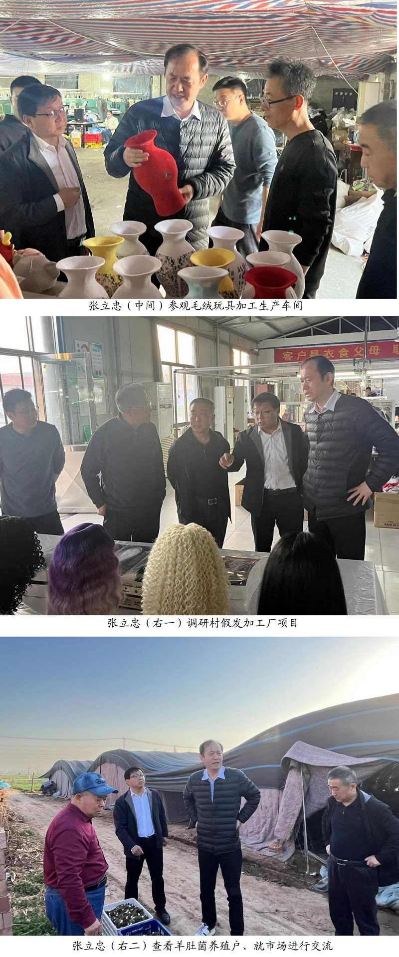 调研工作由曲周县大河道乡党委书记王贵民陪同,参观了毛绒玩具、假发加工车间和羊肚菌种植基地。会议中介绍了贾庄村当前发展状况、存在问题以及未来发展规划。下沉工作队队长齐连洪汇报了工作队近期走访调研及项目谋划的工作进展和下一步工作打算。