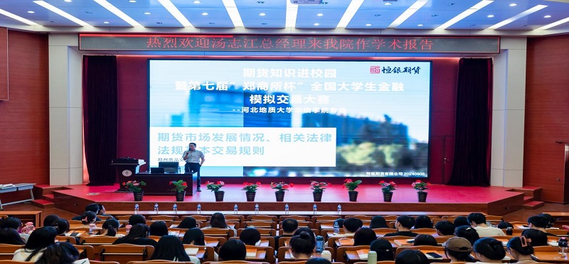 2024年6月5日,恒银期货总经理汤志江率领团队在河北地质大学华信学院报告厅开展了一场别开生面的“期货知识进校园”活动,并同步举办了第七届“郑商所杯”全国大学生金融模拟交易大赛——河北地质大学华信学院专场宣讲会。为了预热本次活动,校方在公众号发布了活动通告,受到了各系学生的热烈追捧,参会人数超过300人。此次活动旨在加强期货知识在校园的普及与推广,提升大学生对金融市场的认识与理解,同时也为广大师生提供了“郑商所杯”这样一个展示才华、交流学习的平台。