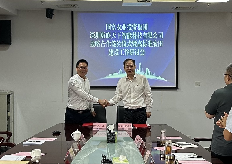 7月2日,国富农业投资集团与深圳数联天下智能科技有限公司签订战略合作协议,为国富农业投资集团加快培育农业新质生产力、打造省内一流高标准农田建设项目注入科技新活力。国富农业投资集团党委副书记、副董事长、总经理张立忠,集团党委常委、常务副总经理马国栋,集团党委委员、副总经理李其强,及相关业务骨干同数联天下副总裁邓才良一行进行工作研讨并见证签约仪式。