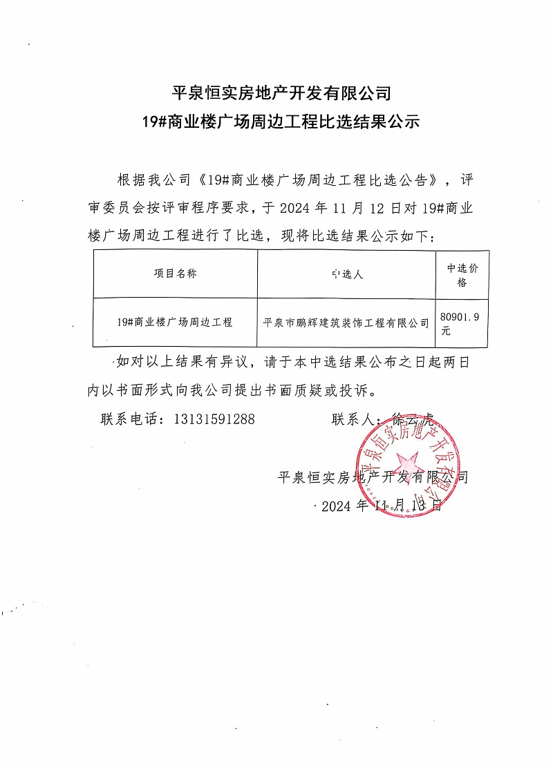 平泉恒实公司19#商业楼广场周边工程比选结果公示
